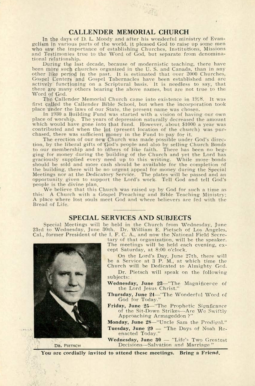 The Callender Memorial Church records its beginning to be the Callender Bible School formed in the fall of 1928. The name changed to Callender Memorial Church when the church was incorporated. The congregation met at the Malta Temple until the new church building could be occuplied in June of 1937.