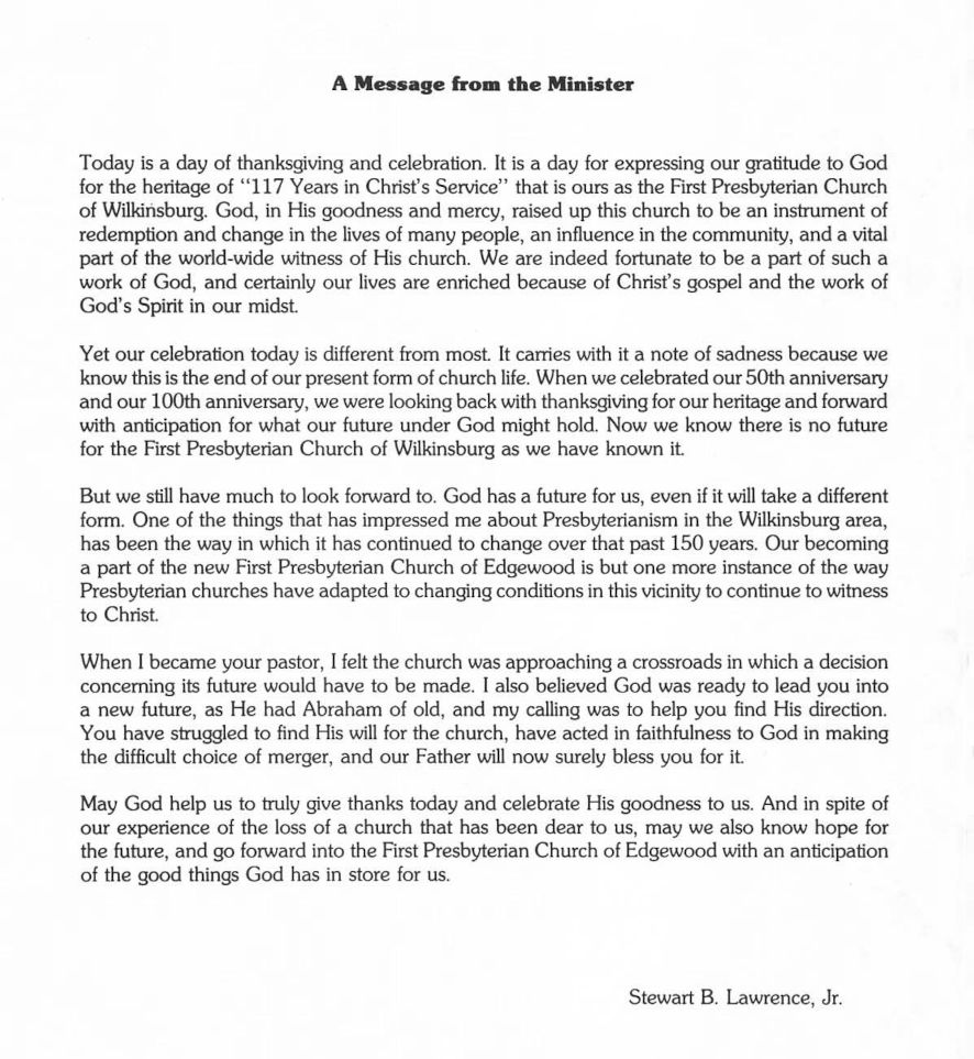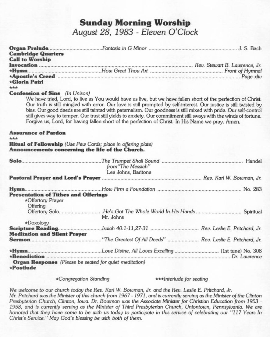 “First Presbyterian Church of Wilkinsburg: 117 Years in Christ’s Service 1866–1983” Program, pp. 1–4, 8–9.