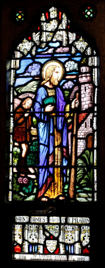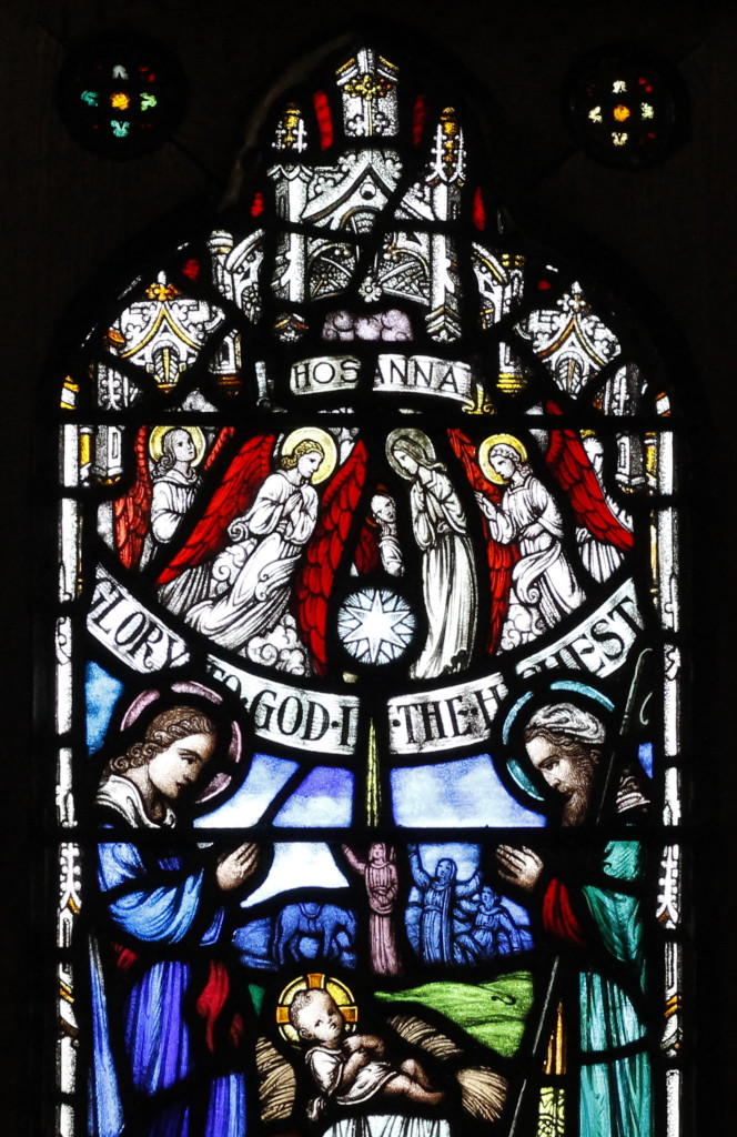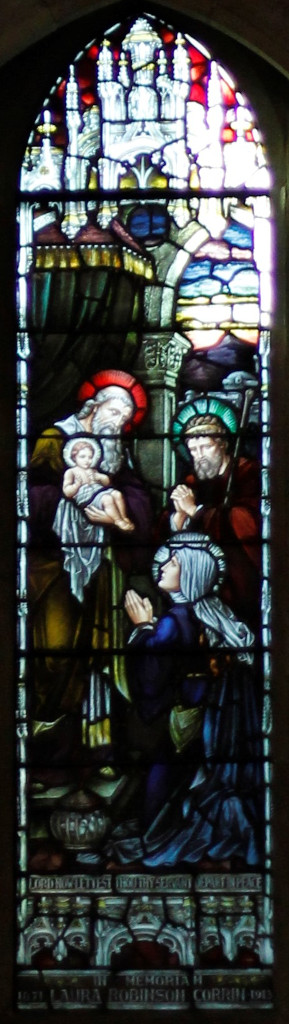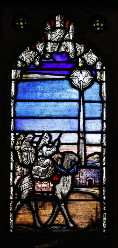 To the left in this group of three windows is the message of Epiphany Tide—the three wise men—Magi or Kings—riding on their camels from the East. “Now when Jesus was born in Bethlehem of Judea in the days of Herod the king, behold, there came wise men from the east to Jerusalem." (King James Version, Matthew 2:1) The camels are loaded with boxes holding the gifts for the Christ child, gold “symbolizing Christ’s immortality and purity,” frankincense “symbolizing prayer and sacrifice,” and myrrh “symbolizing mortality” used later in wrapping his body for the tomb. (Matthew 2:11) Their camels are moving toward a bright star—the Advent star, its rays shining down on what appears to be a stable. (“Epiphany commemorates Christ’s first manifestation to the gentiles as the promised Messiah, symbolized by the visit of the Wise Men.” Some astronomers have suggested that the star was the bright planet Venus.) The shield beneath this window is this bright star—five pointed—with shining rays. (One interpretation of five is that “it is the number of grace.”)