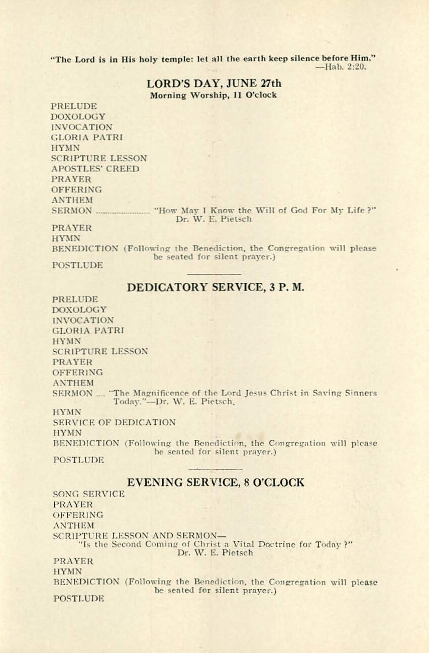 The Church has no high-marks of stately, dignified, architecture but it is a place home-like, and neatly furnished, where believers may reverently worship God in Spirit and in Truth, without the fear of a heavy mortgage. A Hammond organ has been installed and, except for the pews, which have been delayed, the auditorium is completed.