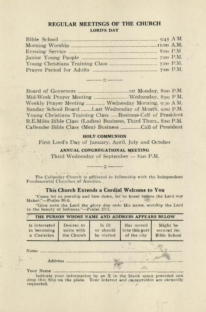 The Callender Memorial Church records its beginning to be the Callender Bible School formed in the fall of 1928. The name changed to Callender Memorial Church when the church was incorporated. The congregation met at the Malta Temple until the new church building could be occuplied in June of 1937.