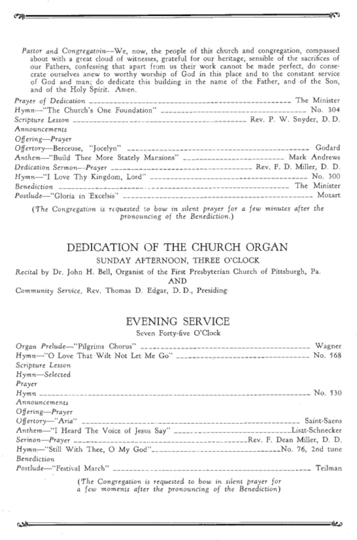 The congregation dedicated the church building at Swissvale Avenue and Hill Avenue on November 5, 1905.