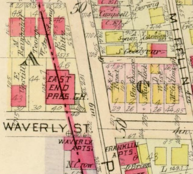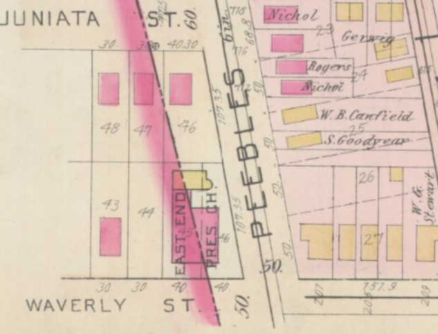 The Hopkins map for 1903 and 1915 show about half of the church building to be in Wilkinsburg and half in Pittsburgh.