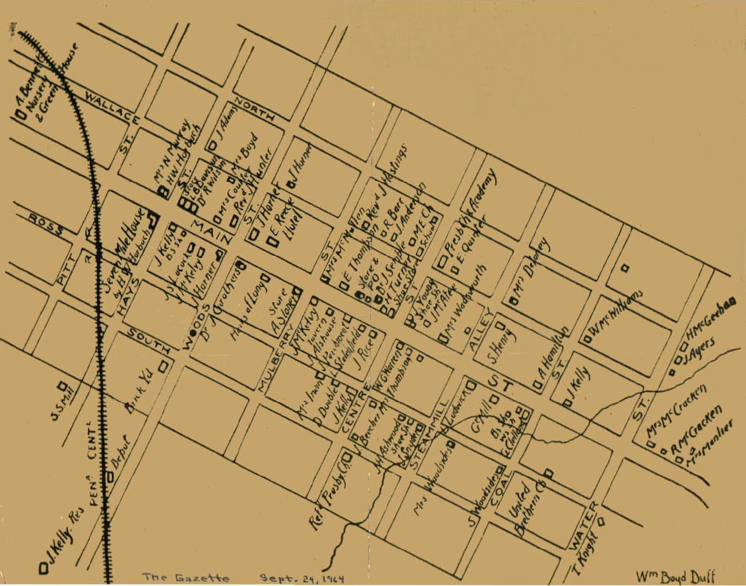 On the north side of Penn between Mulberry and Center there were houses of Mrs. McMullen, E. Thompson, Store, Post Office, Dr. J. Semple, H. Turner and a shoe store. On south Penn between Mulberry and Center were the J. McKelvy house, a tavern, then houses of J. Alshouse, J. Perchment, L.Statenfield and J. Rice. Facing Ross between Mulberry and Center were houses owned by Mrs. Irwin, D. Double and J. Kelly.