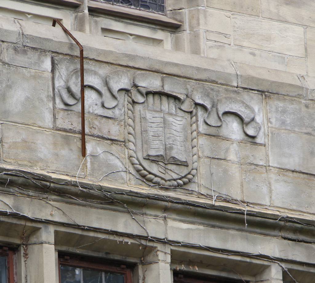 On this facade we also find carved stone panels, not found elsewhere, including keys over shields flanking the entry door and rosettes within the archway, a carved book over a shield, topped with a ribbon at the top of the window bay, and panels obscured by ivy atop the service door at the right of the facade.