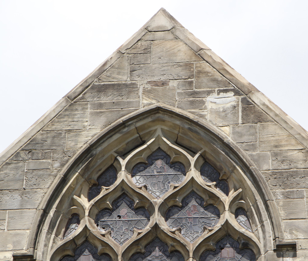 In contrast to the narrow windows and closed-ness of the tower, are the expansive and open window openings on either side of the tower, which house monumental stained-glass windows. The windows themselves consists of seven bays of geometrical floral patterns and biblical symbols, set within ornate carved wood tracery.